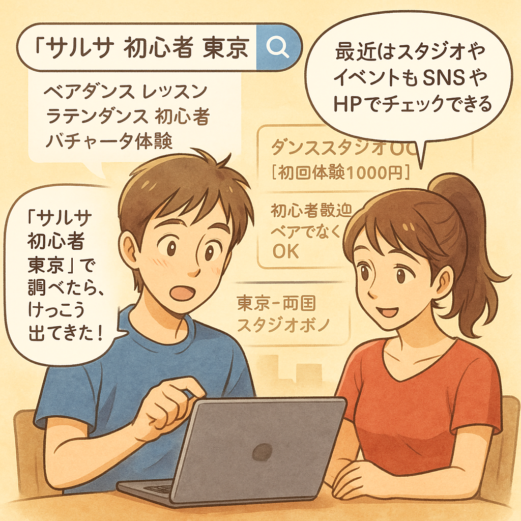 男性「“サルサ 初心者 東京”で調べたら、けっこう出てきた!」 女性(経験者) セリフ:「最近はスタジオやイベントもSNSやHPでチェックできるよ」