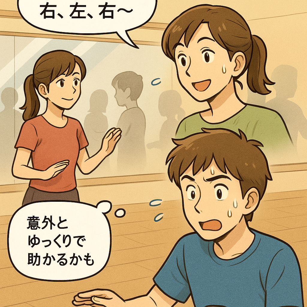 先生:「まずは基本ステップから!右、左、右〜」 女性:「意外とゆっくりで助かるかも」 男性:「あれ?右ってこっち?💦」