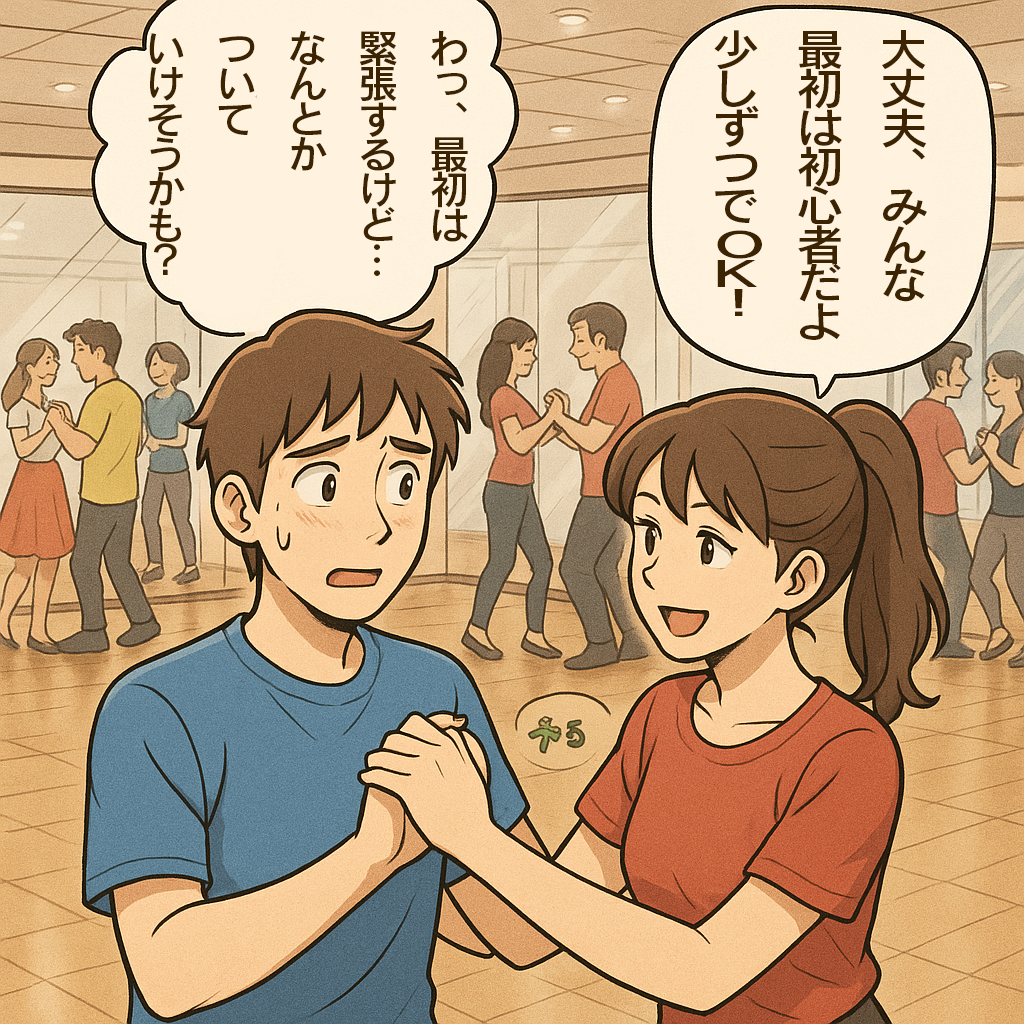 男性(心の声):「わっ、最初は緊張するけど…なんとかついていけそうかも?」 女性(話しかける):「大丈夫、みんな最初は初心者だよ。少しずつでOK!」