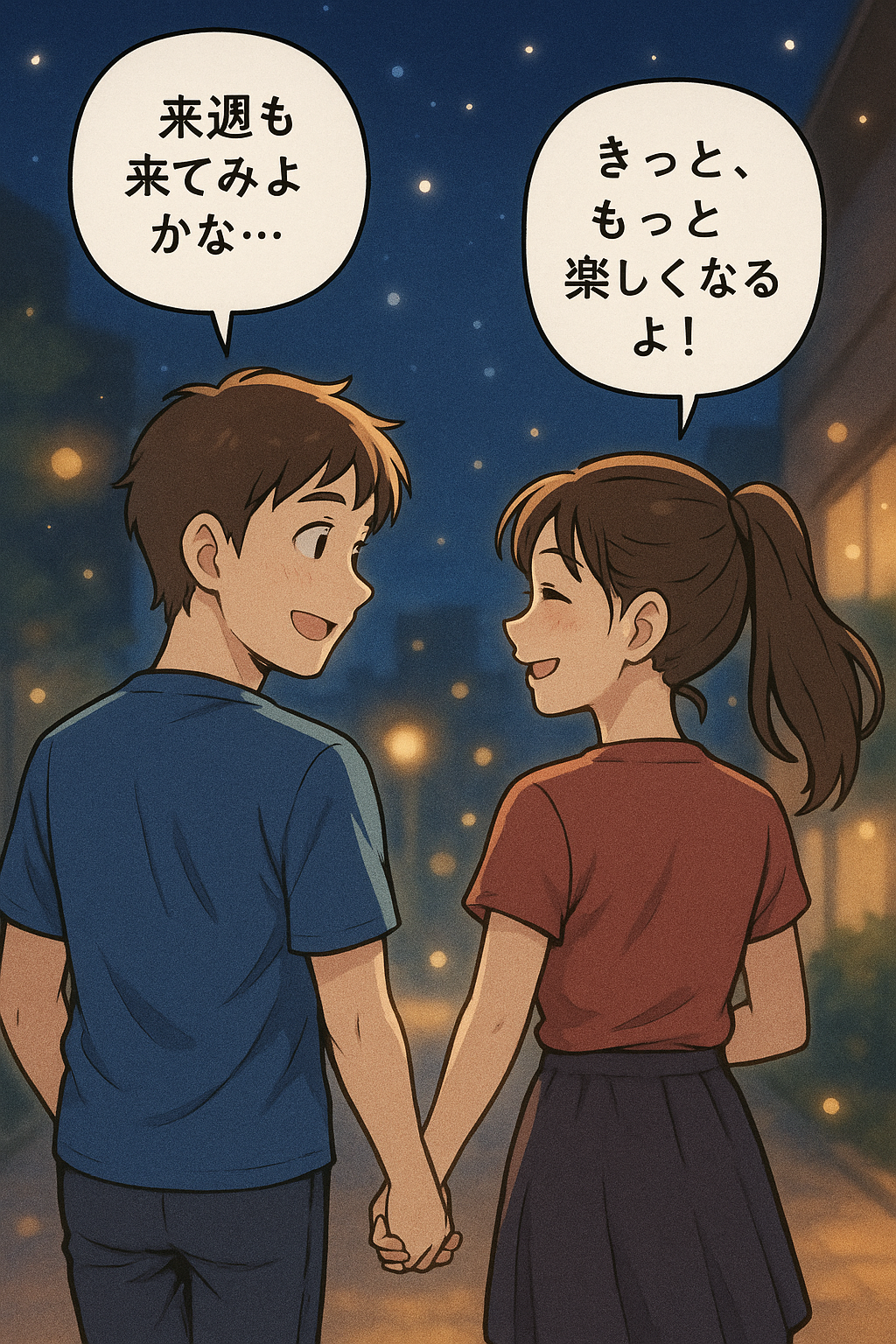 男性:「来週も来てみようかな…」 女性:「きっと、もっと楽しくなるよ!」