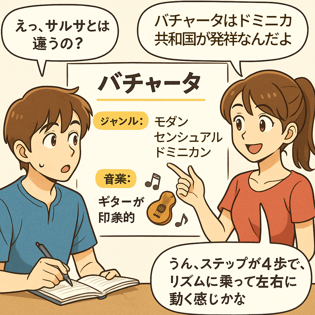 女性:「バチャータはドミニカ共和国が発祥なんだよ」 男性:「えっ、サルサとは違うの?」 女性:「うん、ステップが4歩で、リズムに乗って左右に動く感じかな」