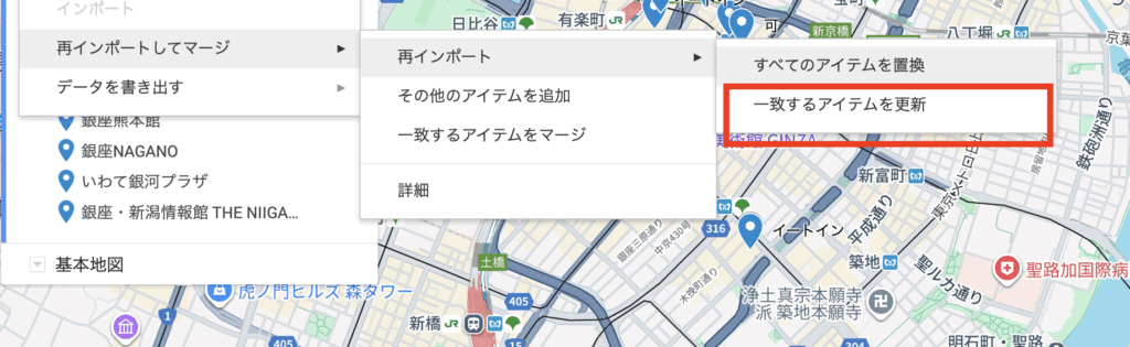 4. 該当するレイヤーで「再インポートしてマージ」→「再インポート」→「一致するアイテムを更新」