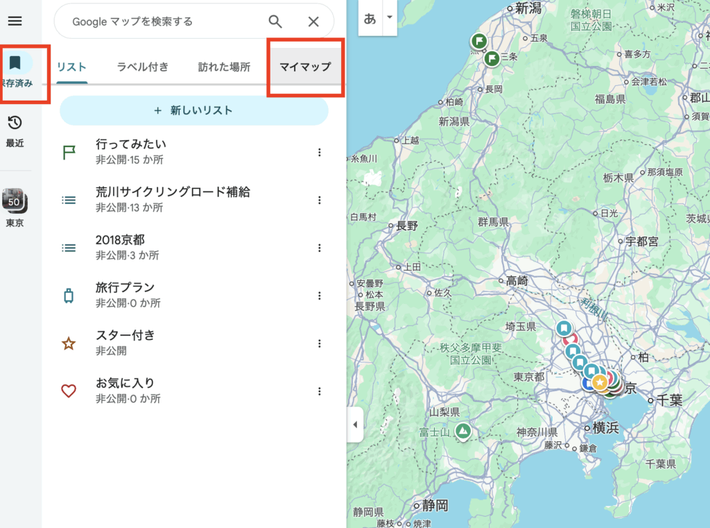 2. デスクトップ版GoogleマップからGoogleマイマップにアクセスは、メニューの「保存済み」から「マイマップ」から探せます